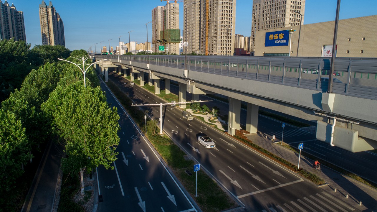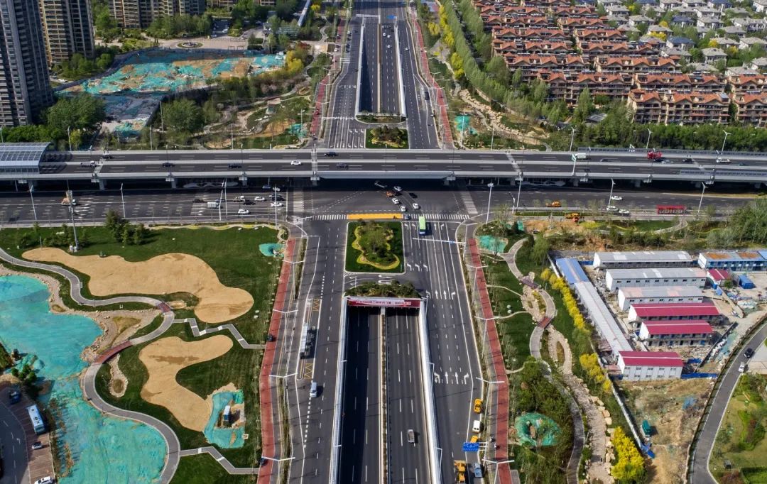 寶通街快速路一標(biāo)段園林景觀綠化工程,分為景觀和綠化兩個(gè)部分,其中景觀部分包括園路4070㎡、景觀橋6座、耐候鋼擋水堰1000m、澆灌管道10725m、景觀雕塑小品、景石等,綠化部分面積為97000㎡,包括喬灌木2917株、地被模紋470萬株、草坪30265㎡。